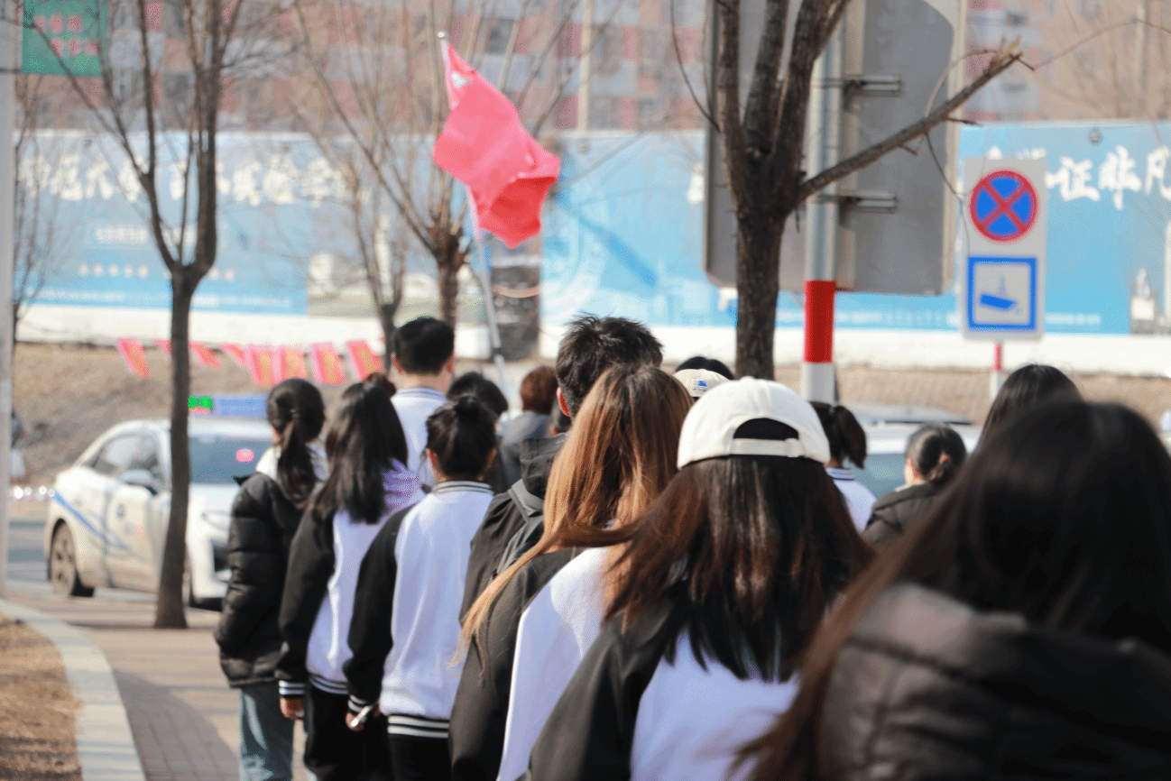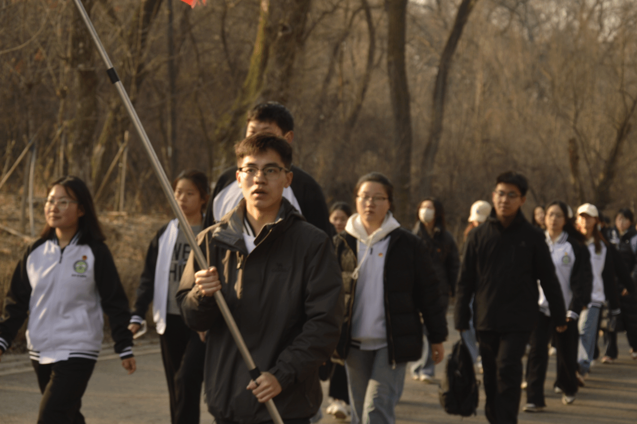 清晨6点30分的新校区北门,全体成员迅速集结、整齐列队。出发指令下达后,大家怀着庄严肃穆的心情,开启了前往革命烈士陵园的徒步之行。队伍沿着街道有序前行,脚步声与呼吸声交织成沉稳的节奏,天气凄清寒冷,微风不时带动衣角与旗帜飘动。尽管路途不近,却无人喊累,每个人都神色凝重,怀揣对革命先烈的敬仰,坚定地迈向陵园。