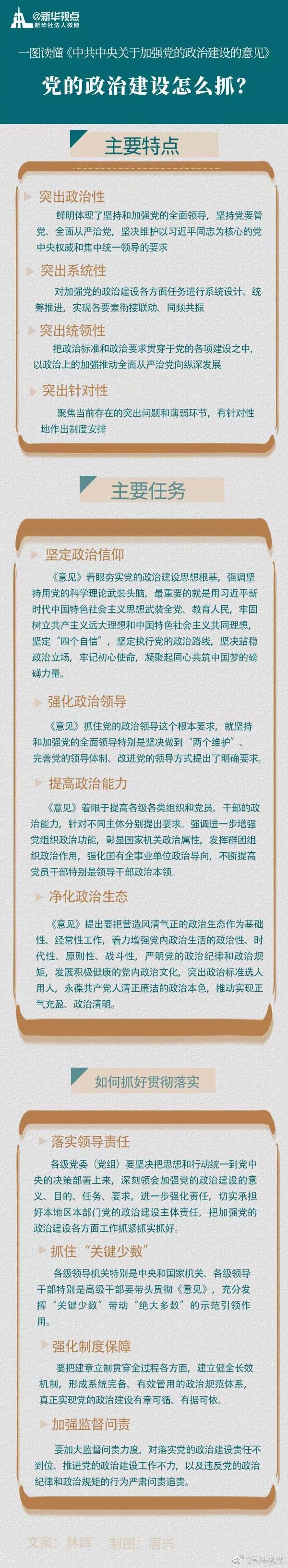加强党的政治建设是一项重大艰巨的政治任务。各级党委(党组)要按照党中央要求,进一步增强推进党的政治建设的自觉性坚定性,加强组织领导,强化责任担当,确保《意见》提出的各项任务举措落到实处,把我们党建设得更加坚强有力,为实现“两个一百年”奋斗目标和中华民族伟大复兴中国梦提供坚强政治保证。
